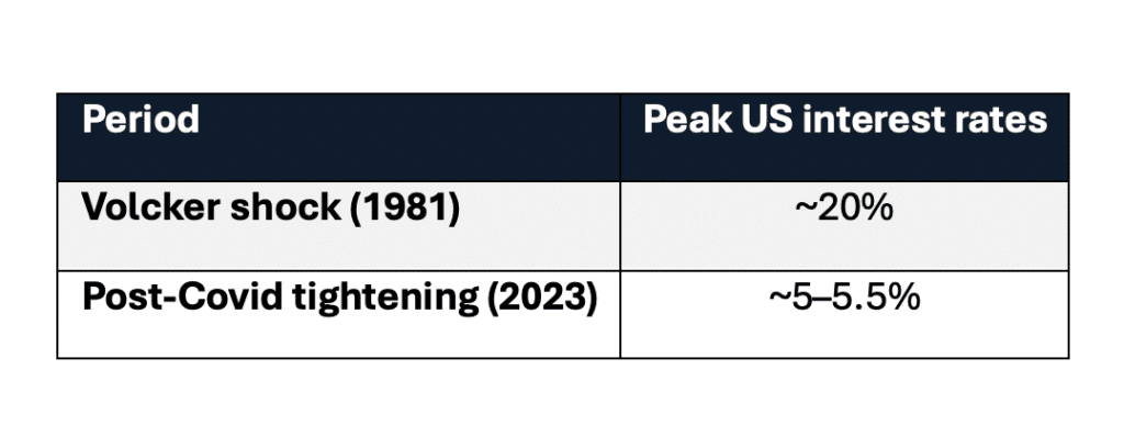 Selon les normes historiques, le cycle de resserrement, qui a suivi les années COVID, pourrait presque sembler homéopathique par rapport à la thérapie de choc appliquée par Volcker. Ce qui soulève une question difficile. Si un véritable épisode stagflationniste se reproduisait, l’économie mondiale actuelle, très endettée, survivrait-elle à la même médecine ?