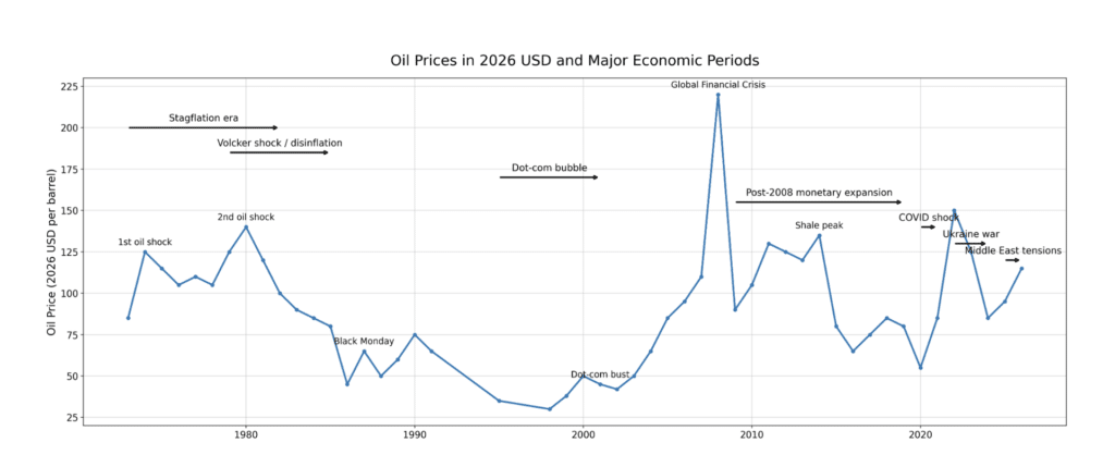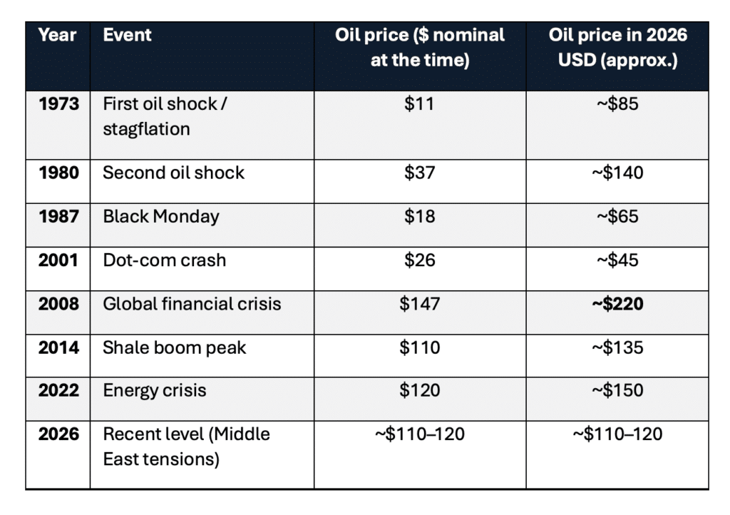 En termes réels, la flambée du pétrole de 2008 a été plus importante que les chocs des années 1970, un fait souvent oublié lorsqu’on parle de la crise financière.
