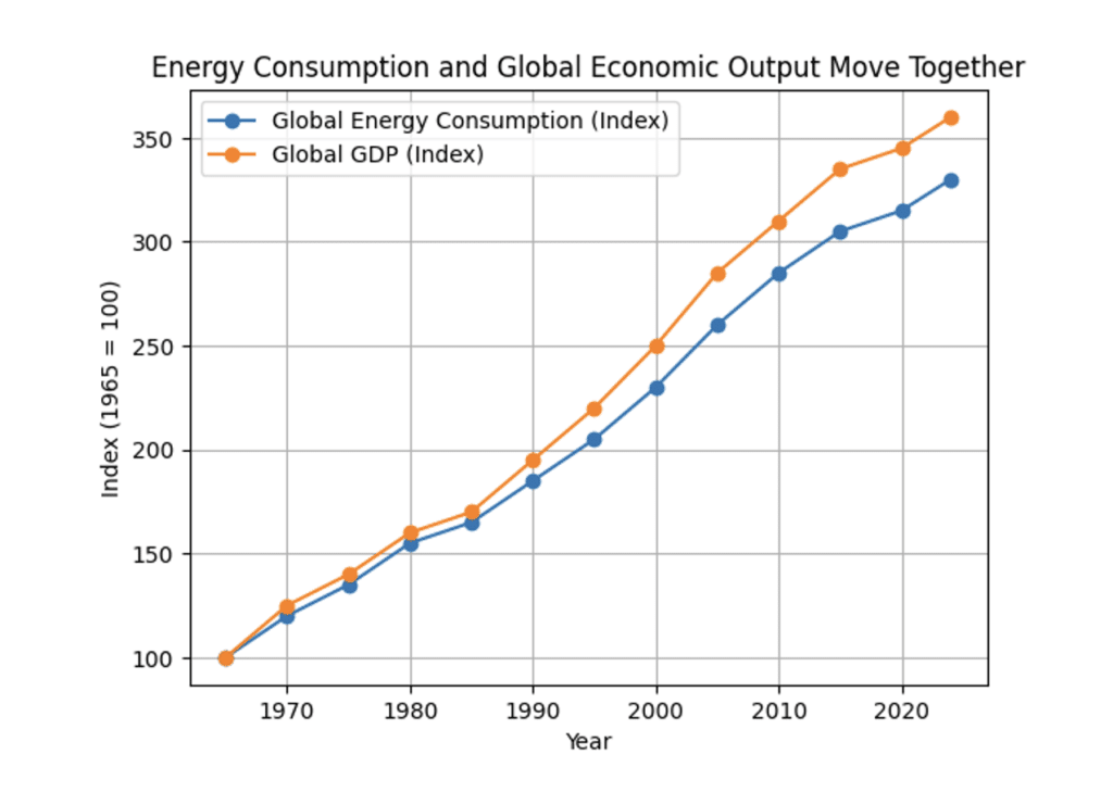 Le graphique illustre un fait historique frappant : sur de longues périodes, la production économique mondiale et la consommation mondiale d’énergie évoluent presque en parallèle. À bien des égards, la civilisation industrielle est tout simplement un système énergétique.