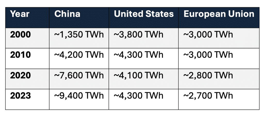 Au début du siècle, la production d’électricité de la Chine restait bien inférieure à celle des États-Unis et de l’Europe. Au cours des deux décennies suivantes, elle a non seulement comblé cet écart, mais a dépassé les deux ensembles.