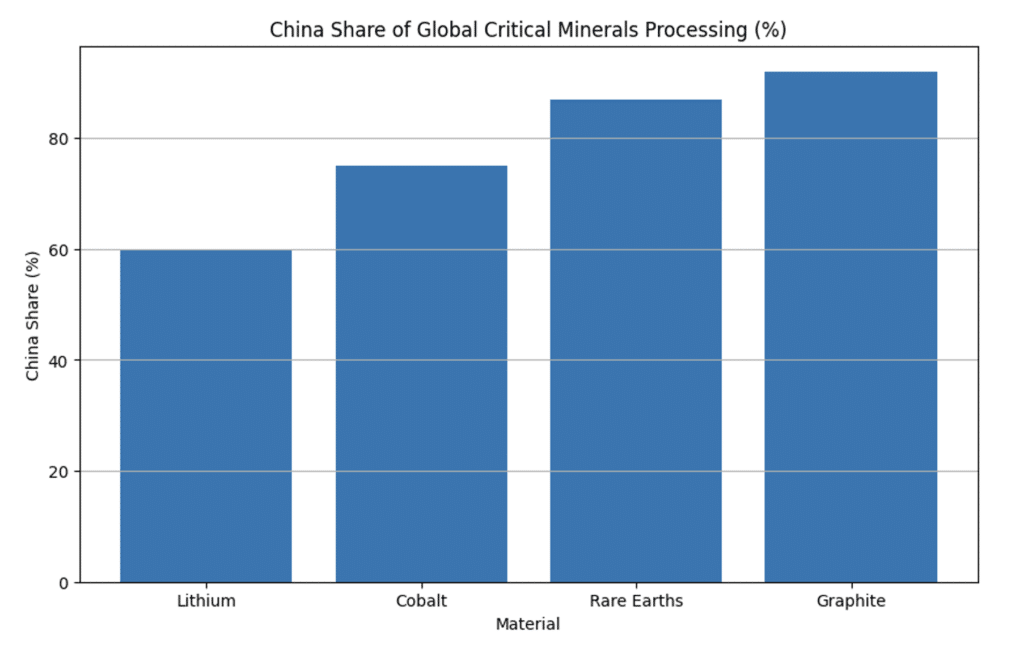La position de la Chine dans ce système émergent n’est pas principalement due à son contrôle de l’extraction, mais à sa domination dans le traitement et le raffinage. C’est à ce stade que les matières premières deviennent des intrants utilisables, et donc que réside une grande partie de l’effet de levier.