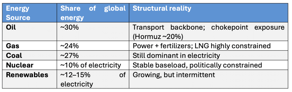 Les flux énergétiques mondiaux restent concentrés et, sous contrainte, étonnamment rigides. Le pétrole, le gaz et l’électricité ne sont pas des abstractions interchangeables ; ce sont des processus physiques limités par l’infrastructure, la géographie et le temps. Lorsque ces contraintes se resserrent, l’ensemble de la structure économique le ressent presque immédiatement.