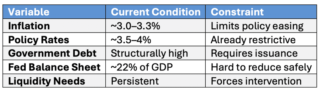 Si l’on considère non pas les intentions, mais les contraintes, la direction à suivre devient plus claire. Un système caractérisé par une dette structurellement élevée, des limites politiques à l’austérité et une banque centrale qui revient déjà, discrètement, à l’expansion de son bilan, a peu de chances de soutenir une discipline monétaire prolongée. L’option théorique demeure, mais la capacité pratique à la mettre en œuvre s’affaiblit à chaque cycle.