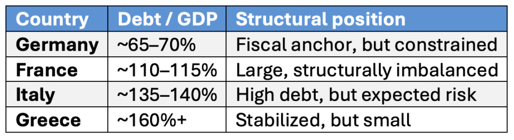 Ce qui se dessine aujourd’hui n’est pas une répétition de la crise grecque, mais quelque chose de potentiellement plus difficile à résoudre. La Grèce était suffisamment petite pour être stabilisée par un soutien extérieur. Ce n’est pas le cas de la France. La France est devenue, à bien des égards, le maillon faible, non pas en raison d’un effondrement soudain, mais à cause des déséquilibres structurels accumulés : dépenses publiques élevées, déficits persistants, niveaux d’endettement croissants.