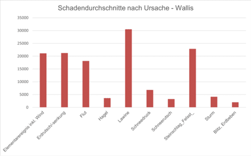 Die Detailauswertung für das Wallis von 2000 bis 2025 zeigt allerdings ein differenzierteres Bild: Mit durchschnittlich gut 30’000 Franken pro Schadenfall zählen Lawinen zu den teuersten Elementarereignissen.