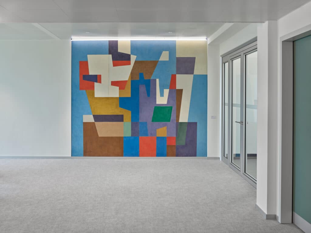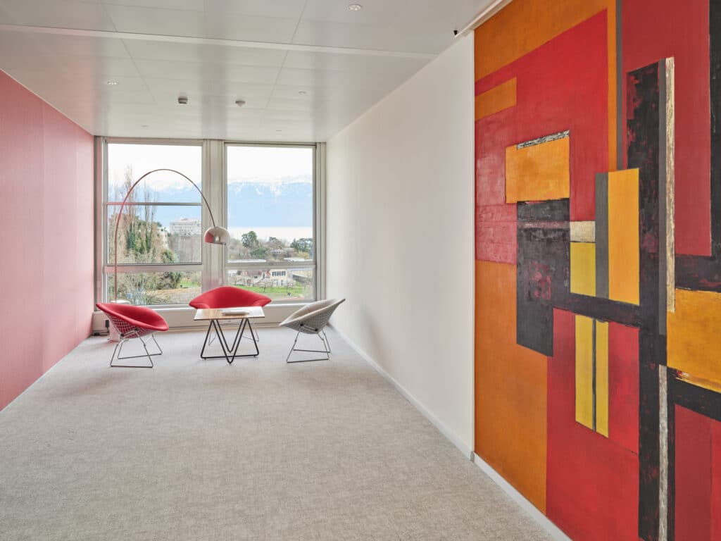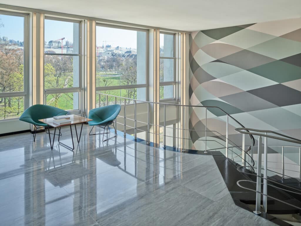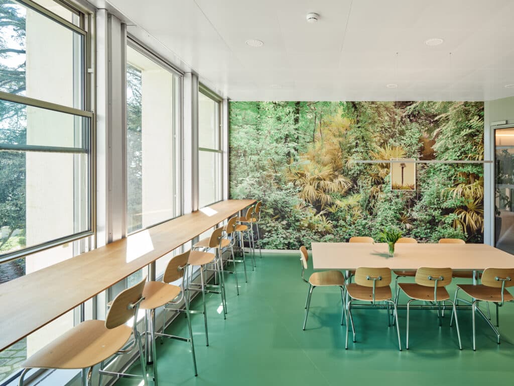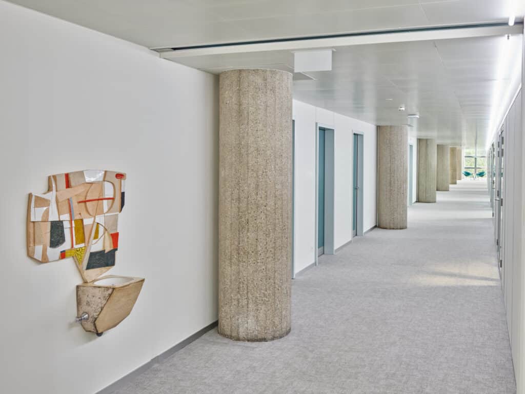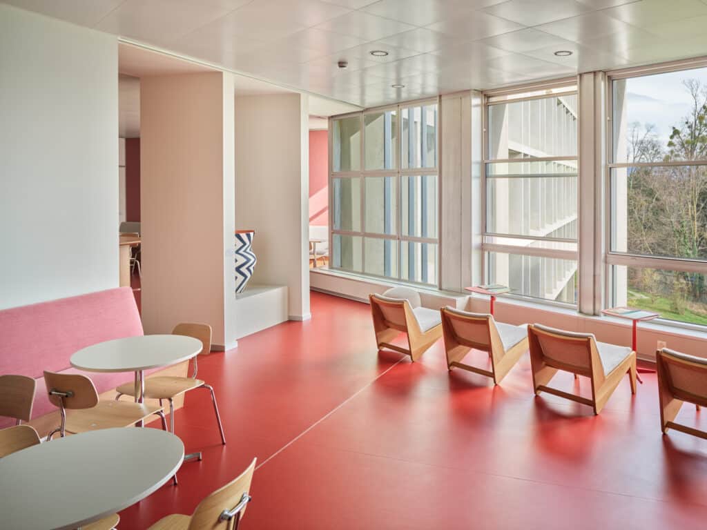 Der Innenausbau durch CCHE orientiert sich an Tschumis Farbkonzept und schafft zugleich klare Orientierung im Gebäude. Materialien, Farben und Mobiliar greifen ineinander und stärken die architektonische Identität. Gleichzeitig erfüllt das Gebäude die Anforderungen des WELL-Gold-Standards und stellt das Wohlbefinden der Mitarbeitenden in den Mittelpunkt.